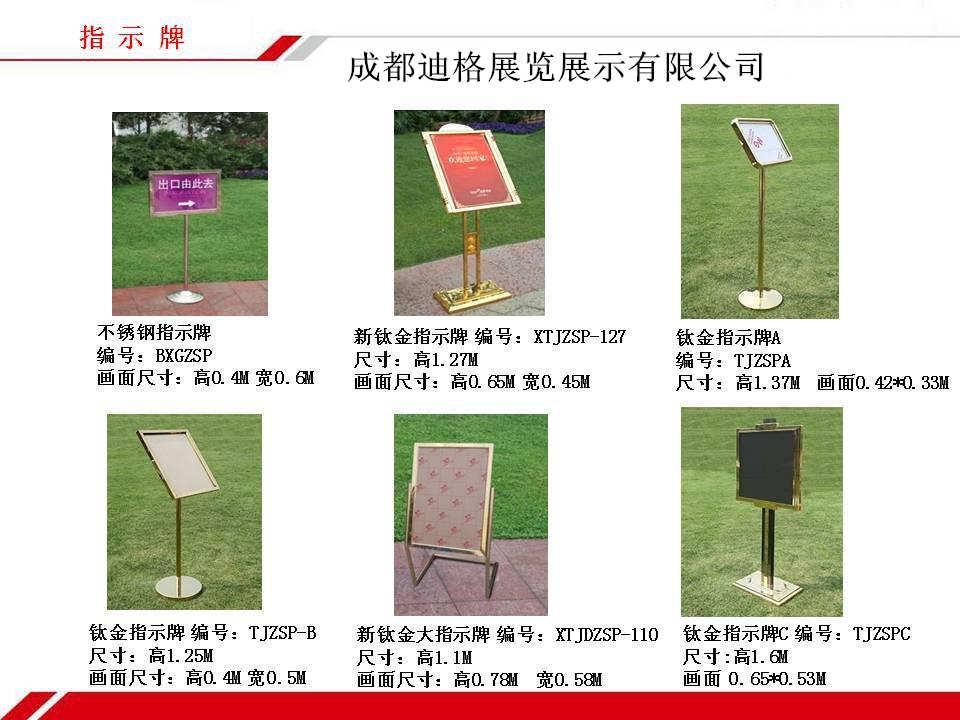 指示牌可以放在展會(huì)展臺(tái)附近,以方便別人很快的找到展臺(tái)。所以展覽展示中,指示牌是很重要的。我公司租賃的指示牌材質(zhì)有:不銹鋼的、亞克力的、鈦金的、冷扎板的、鋁型材的、黃銅的、木制的、LED等。